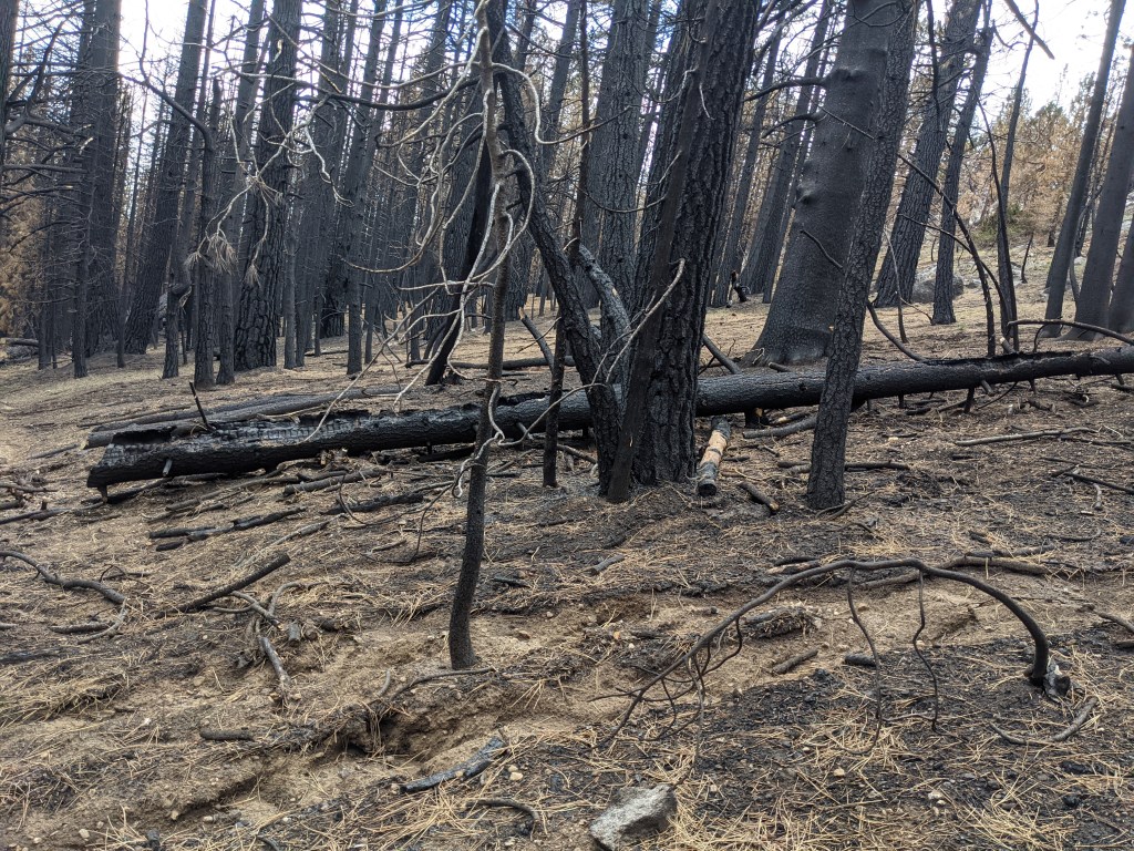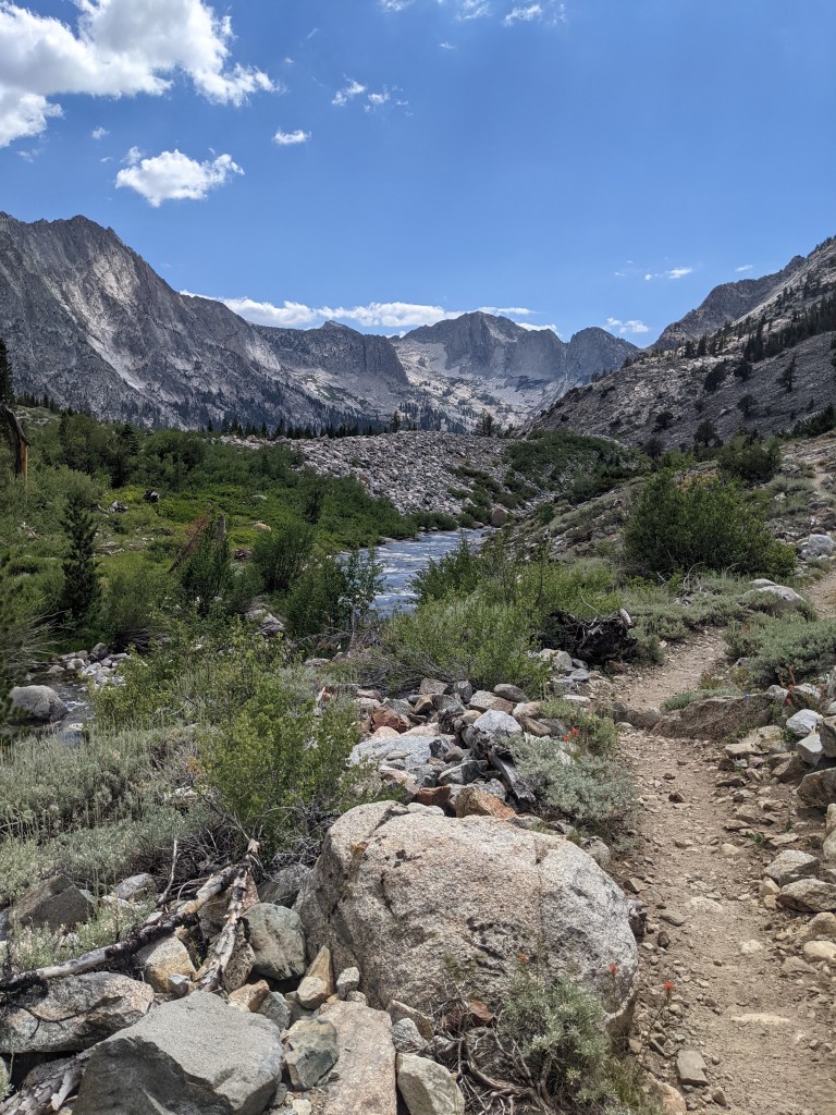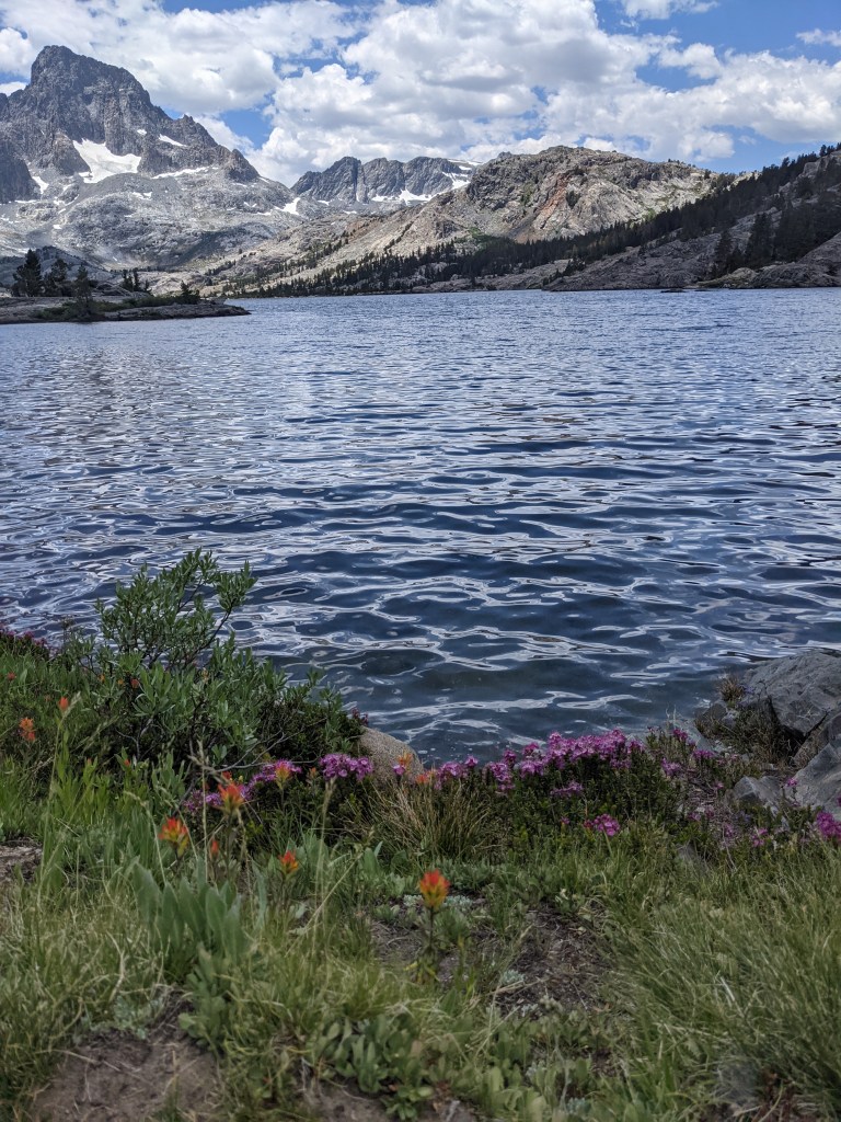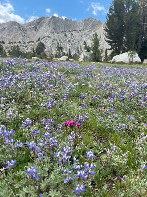 The John Muir Trail was an illuminating sensory experience. My virgin eyes gazed upon a world so foreign, it might as well have been a walk on another planet. Sometimes the terrain actually mirrored our lunar moonscape! Alpine lakes are ubiquitous in the June Sierras and are a stunning sight to distract a hiker from simply focusing on making the miles. Lakes and streams flowing crystal clear water, reflecting the blues of the sky and the greens of the surrounding pines and hemlocks are invitations to stop for a refreshing swim or enjoy nature’s pedicure by soaking tired and blistered feet. Admittedly, if I never cross another creek in my lifetime, it will be too soon, but thanks to the low snow year, none of the crossings were as dangerous as they would have been normally. From verdant valleys filled with the purples, yellows, and reds of wildflowers to the black death and glaring silence of a charred woodland scarred by forest fires of recent years, each section of the trail had something to teach those filled with wanderlust to experience her.