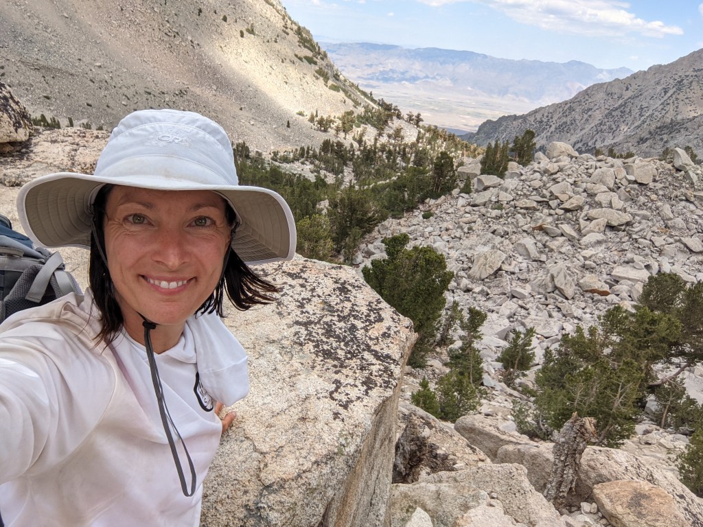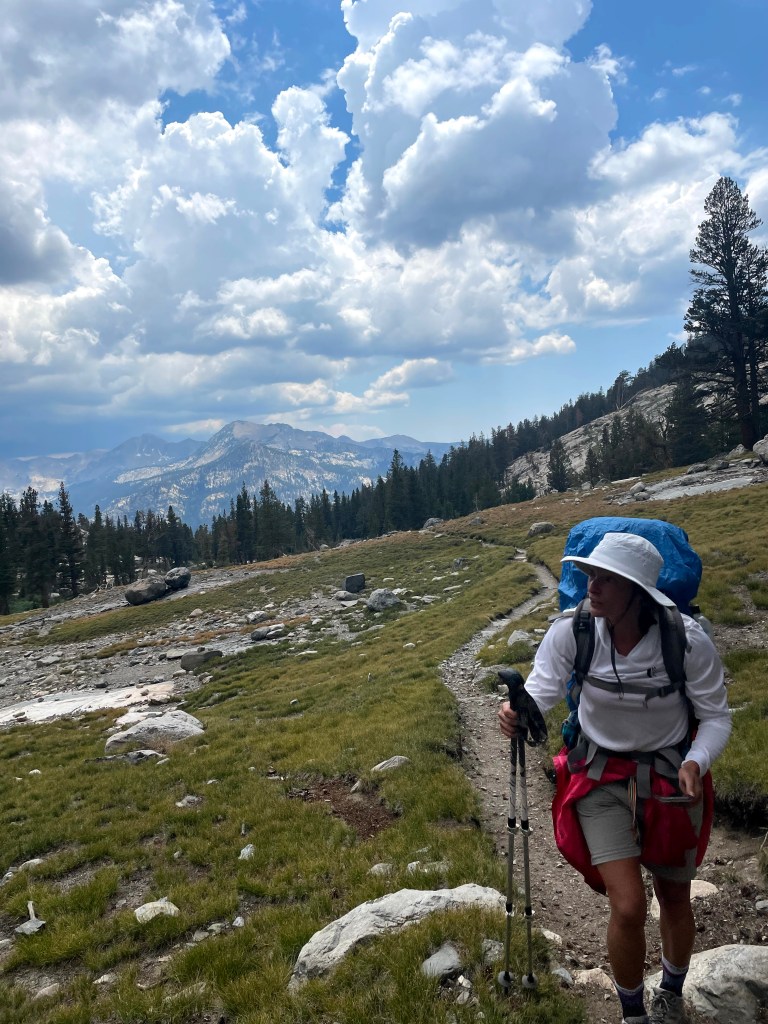 My ears heard foreign sounds. Nighttime noises such as the eerie cacophony of wailing coyote packs were frequent lullabies. Thunder at exposure, over 10,000 feet high, boomed at a previously unimaginable decibel level and echoed across the canyon below. My sense of smell was excited by breathing the crispest, cleanest air yet confused by air so dry that my nose never could quite adjust to it. My taste buds soaked up the deliciousness of drinking the purest water yet protested the grossness of another peanut butter and jelly-smeared tortilla that I had to force down my throat. I felt the skin-prickling refreshment of a swim in frigid mountain lakes on hot, sweaty days. My hands were gloved in thick layers of dirt accumulating between washings, and the exposed skin on my body felt the heaviness of days of built-up oil, sweat, Deet, and sunscreen. The sunshine at JMT elevations where shade is nonexistent for most hours of the day microwaves skin, so my favorite trail hours were early morning when I could hike in daylight not yet touched by the sun still hiding behind surrounding mountains. The constant companions of tiny mosquitoes, so numerous their hums were audible, presented a massively miserable challenge. So determined were they to feast on their new friend that they would light on my shirt and pierce their proboscis through my Permethrin treated clothes for a taste of the blood flowing under my skin. Visualize this — a hiker squatting and swatting those suckers from unmentionable areas while uncomfortably trying to take care of business on the side of a mountain was misery defined in the moment but something to giggle about later.